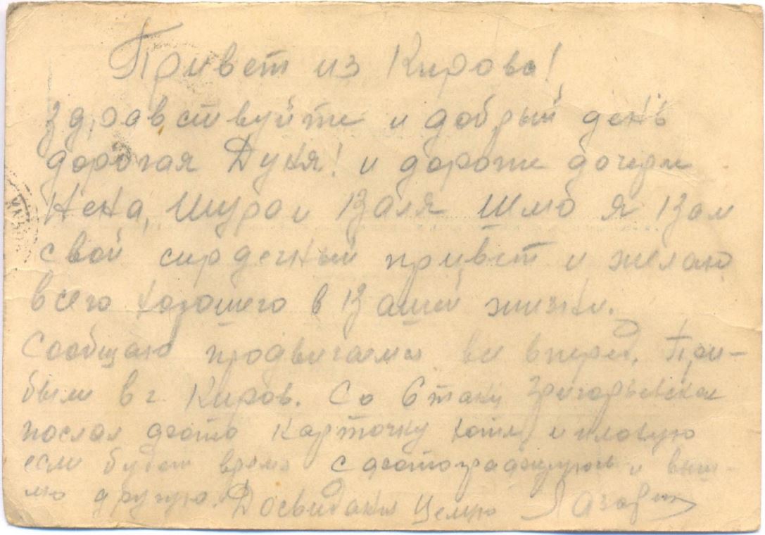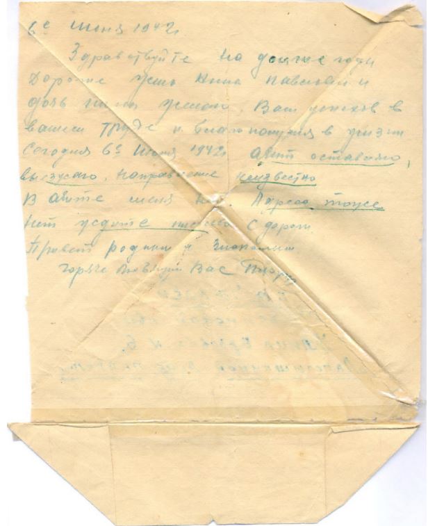 Здравствуйте и добрый день дорогая Дуня и дочери Нина, Шура и Валя шлю я вам привет и всего хорошего в жизни вашей а главное здоровья. Передайте по привету Родным и знакомым. Я жив здоров чувствую себя не плохо, нахожусь в пути. Направление неизвестно. До свидания.