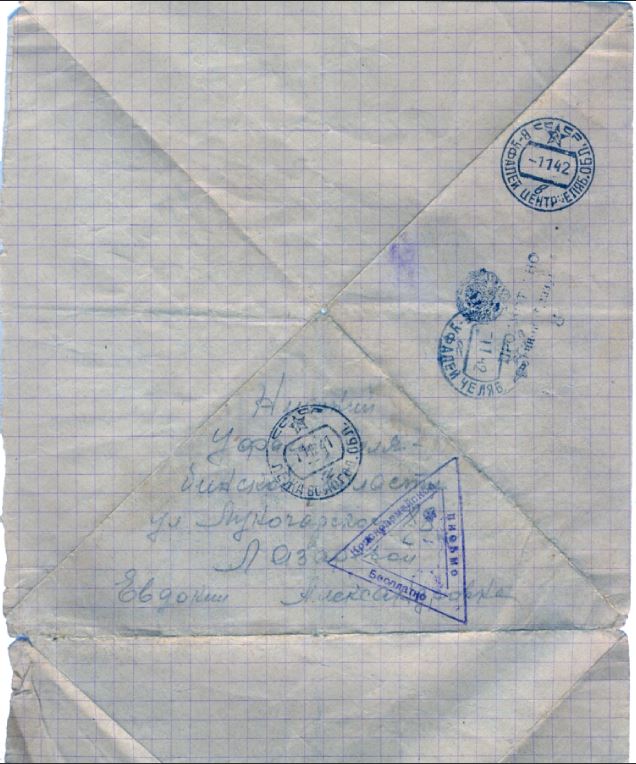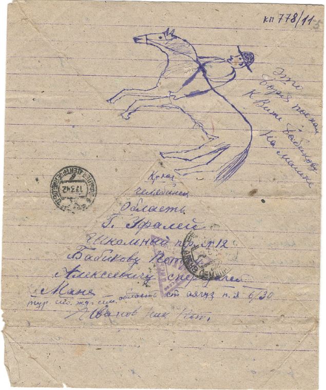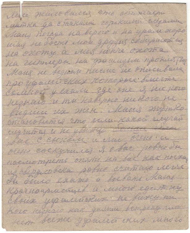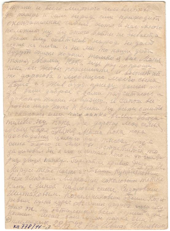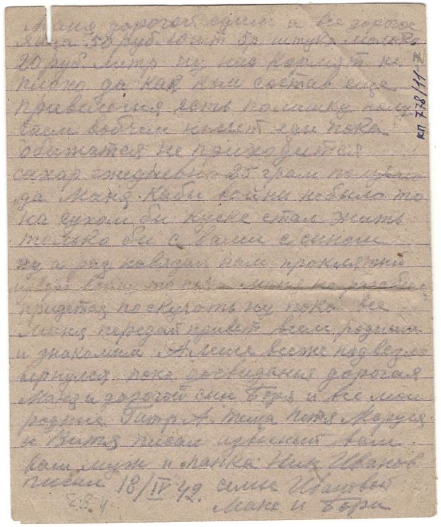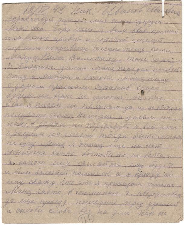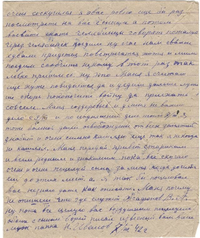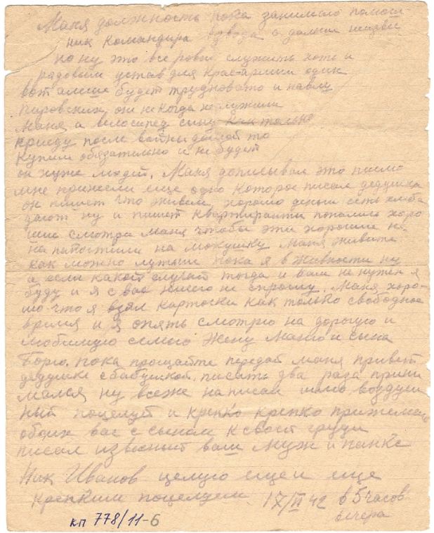 Здравствуй дорогая моя семья супруга Маня сын Боря шлю я вам свой кр-кий пламеный привет и горячий поцелуй еще шлю по привету тестю теще пети марусе Вите Валентину тоне юре и Бабушке затем Маня передай привет Отцу и Матери и Няньке Маня пишу с дороги приехали Саратов скоро будем наверно на фронте от вас счас я писем не получаю да и не откуда получать хотя которые и услали то нам в дороге ни передают а вот уже приедим на место тогда быть может получу Маня я опишу еще на счет сыньеных сапог вочтобы то, не встало а сапоги ему сделайте ему будет и вам большей поминок а я приеду то ему скажу что это я приказал сшить Маня часто вспоминаю г. свердловск да еще проезд последний через уфалей и сыновье слова все на уме как он мне жаловался что обижает матка да стакими горькими слезами Маня погода наверно и на урале хорошая небость мои друзья собираются на охоту а моя нонче охота на гитлера на фашизм проклятый Маня не водном писме не описывала про уфалейских которые вместе сомной уехали где оне я ни кого незнаю и ты наверно никого не видиш их жен. Маня жутко становится что если какой случай случится и не увижу больше всех вас с сыном и счас очень и очень соскучился я о вас ровно бы посмотреть опять на вас как поехал из свердловска ровно считаю легче бы было ехать и воевать Маня Красноармейцев и много едит ту своих уфалейских не вижу ни кого незнаю как дальше встречу или нет всеже уфалей ских много в армию взяли ну да Маня сдесь все одинаковые и знакомые да еще лутьше с чужимито я еду с лейтенантом вместе рядом лежим в месте кушаем в месте пищу и даже табачок из одного кашелька курим только весь вышел счас наверно до места не получим парень хоть молодой ну толковый говорит ну Иванов в месте будем воевать Маня еду на фронт пом. ком. взвода прийдется бойцами командовать да и счас приходится командовать Маня хоть бы повстречатся с Александром Петровичем вот было бы унас сним радости скоро год как не видемся он спервых дней войны все на фронте я уже шестой месяц как издома а кажется Маня уже больше чуть ли не год ну ничего Маня неподелаеш Маня дорогой едим и все дорогое яица 50 руб. 10 шт 5 р. штука молоко 20 руб. литр ну нас кормят не плохо да как ком состав еще привелегия есть полистку получаем вобчем насчет еды пока обижатся не приходится сахар ежедневно 25 грам получаю да Маня кабы войны не было то на сухом бы куске стал жить только бы с вами с сыном ну а раз навязал нам проклятый изверг войну то пока Маня не разобьем придется по скучать ну пока все маня передай привет всем родным и знакомым Алеше всеже подвезло вернулся пока досвиданья дорогая Маня и дорогой сын Боря и все мои родные Петр А. Теща Петя Маруся и Витя писал извесный вам ваш муж и папка Ник Иванов писал 18/IV 42. семье Ивановой Мане и Бори