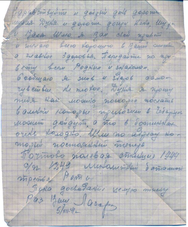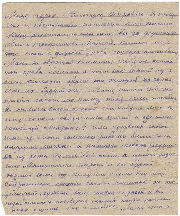 Сообщаю я жив и здоров самочувствие не плохое. Дуня я прошу тебя как можно поскорее послать валенки которые привозили в Чебаркуль может дойдут, а то в ботинках очень холодно. Шли по адресу который постоянный теперь