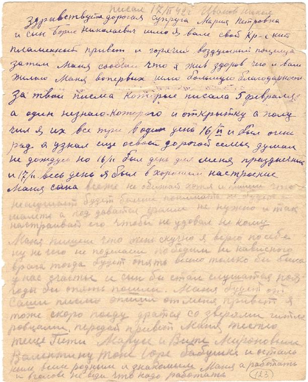Здравствуйте дорогая супруга Мария Петровна и сын Борис Николаевич шлю я вам свой Кр-ский пламенный привет и горячий воздушный поцелуй затем Маня сообчаю что я жив здоров чего и вам желаю Маня вопервых шлю большую благодарность за твои письма которые писала 5 февраля а один не знаю. Которого и открытку а получил я их все три в один день 16/II и был очень рад я узнал еще освоей дорогой семье думал не дождусь но 16/II был день для меня праздничный и 17/II весь день я был в хорошем настроение. Маня сына всеже не обижай хотя и пишешь что непослушный будет больше понимать не будет шалить а под даватся (…) не нужно и так настраивай его чтобы не удовал некому Маня пишешь что очень скучно я верю по себе ну не чего не поделаеш победим не нависного врага тогда будет опять весело только бы было у нас счастье и сын бы слушатся поягоды бы опять пошли. Маня будет от Саши письмо опиши от меня привет я тоже скоро поеду дратся со зверями гитлеровцами. передай привет Маня тестю тещи Пети Марусе и Вите Мироновым Валентину Тоне Юре бабушке и остальным всем родным и знакомым Маня а работать и в голове не веди что надо работать Маня должность пока занимаю помощник командира взвода а дальше неизвестно ну это все равно служишь хоть и рядовым устав для Крас-армии один вот алеше будет трудновато и павлу Пировских оне некогда не служили Маня а велосипед сыну как только приеду после войны домой то купим обязательно и не будет он хуже людей. Маня дописывал это письмо мне принесли еще одно которое писал дедушка он пишет что живем хорошо деньги есть хлеба дают ну и пишет квартиранты попались хорошие смотри Маня чтобы эти хорошие не напакостили на макушку Маня живите как можно лутьше пока я в живности ну а если какой случай тогда и вам не нужен я буду и я с вас ничего не спрошу. Маня хорошо что я взял карточки как только свободное время и я опять смотрю на дорогую и любимую семью жену Маню и сына Борю. Пока прощайте передай Маня привет дедушке с бабушкой писать два раза принимался ну всеже написал шлю воздушный поцелуй и крепко крепко прижимаю обоих вас с сыном к своей груди писал извесный ваш муж и папка Ник Иванов целую еще и еще крепким поцелуем