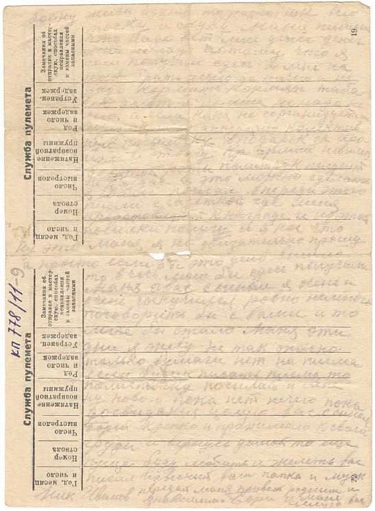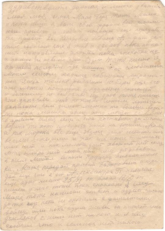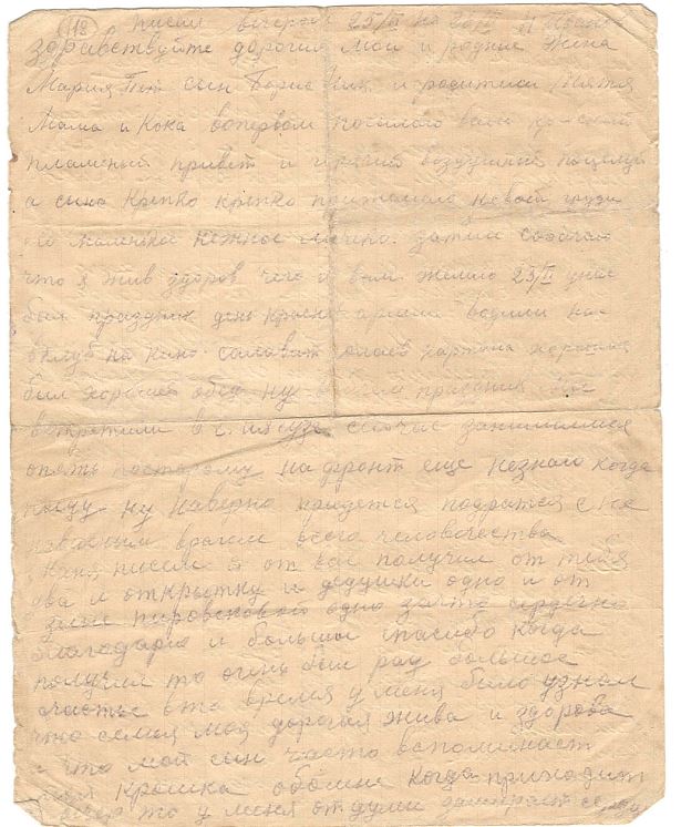 Здравствуйте дорогая и много уважаемая моя семья Маня Боря Тятя Мама и Кока шлю я вам свой фронтовой пламенный привет и горячий поцелуй еще передайте привет Зое Петровне Ивану А. и фаи затем сообчаю что я жив и здоров пока на нашем направление фронта пока спокойно ну а дальше не извесно что будет Тятя писмо я от тебя получил где пишеш что слюбимым моим сыном ходите собирать мурашиные яица только рыбачить не бери еще его ато может потонуть у купальни пожалуй и большому не выбратся ну дров тятя пишеш что запасли это не плохо ситым лутьше запасыть чем зимой можно то больше возите пока машка дома ато могут ее взять в армию тятя если и сена настывите да можно возить то хоть прокорову хоть на возите. Мама а как морька все еще двумя доит сесками или всеми четырми и как же нонче отелилась или нет и как молока дает хвотает нет сыну меня теперь нет мой пай ему отдавайте я очень любил выпить кружку бывало молока. Маня передай привет Бабиковым и передай еще что от Александра П. получил еще одно писмо 25/VI он писал 16/VI он пишет у него тоже пока спокойно я ему Маня тоже написал ответ и будем писать до тех пор пока не окончим с фашистами войну или пока будим живы он пишет что земляков с ним нет ни кого и я ему сообчил что и сомной нет никого