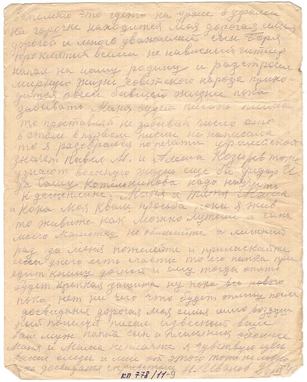 Здравствуй дорогая супруга Маня и сын Боря шлю я вам свои фронтовой пламенный привет горячий поцелуй затем маня сообчаю что я жив пока и здоров чего и вам желаю шлю еще привет тестю теще Пети Марусе Вите Тоне Бабушке Юре затем сообчаю маня что писмо твое получил которое писала 13/V зачто сердечно благодарю и был очень рад маня пишеш что друга (…) зачислили строевиками теперь пусть лидя В. посбировает котомочку ато оне по смеиваются над нами Маня еще сообчаю что я получил писмо от дорогово для меня Шурика был очень и очень рад и узнал что он знает что я тоже уже нахожусь на фронте он сообчает что много похоронил земляков и про (…) андреева сообчил что убило под Москвой Маня ты пишеш что спроси Командира что он холостой или нет сдесь Маня про это и спрашивать не приходится а Шура мне описал что вспомнилось что было то становится страшно и он вспоминает Маня как охотились рыбачили и проводили праздники вместе и сейчас приходится защищать свою землю свою сводную жизнь тоже вместе только на разных на провлениях он на Калининском а я на брянском. Маня пишеш что очень скучно я верю по себе ну нечего не поделаеш закончим войну живы будем то разгоним всю тоску и скуку. Маня пишеш что надо нет мне денег денег мне не надо потому что я их получаю сдесь и мне на них брать нечего да ничего не надо кормить кормят табачек дают а больше ненадо ничего. а если Маня не сорганизуетис через (…) праздничную колективную посылку в подарок за героизм и отвагу Красноармеский (…) (…) роты политрук получит и раздав и это можно сделать (…) послал впереди этого письмо с газеткой где меня приставили к награде и из этой посылки получу и я кое что ну это Маня я не обизательно прошу а просто если бы это дело вышло то в чесь мою бы сдесь получит Маня овас сыном я очень и очень соскучился ровно немного поговорить бы с вами и то легко бы стало Маня эти дни я живу не так опасно только бумаги нет на писма если будеш писать писма то полисточку посылай и (…) ну нового пока нет нечего пока досвиданья целую вас с сыном Борей крепко и прижимаю к своей груди а вернусь домой то еще пуще буду любить и желеть вас писал извесный ваш папка и муж Ник Иванов передай маня привет родным и знакомым. Боря и Маня целую вас
