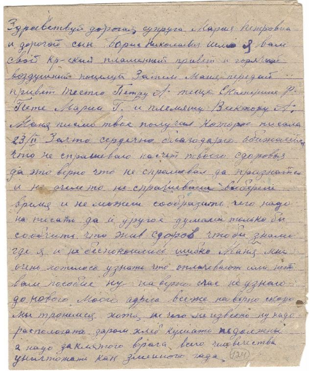 Здравствуй дорогая супруга Мария Петровна и дорогой сын Борис Николаевич Шлю я вам свой Кр-ский пламенный привет и горячий воздушный поцелуй Затем Маня передай привет тестю Петру А. теще Екатерине Ф. Пете Марии Г. и племяшу Виктору А. Маня письмо твое получил которое писала 23/II Зачто сердечно благодарю обижаешся что не спрашиваю насчет твоего сдоровья да это верно что не спрашивал да признатся и не очем то не спрашиваеш выбереш время и не можеш сообразить чего надо на писать да и другое думаеш только бы сообчить что жив сдоров что бы знали где я и не беспокоились шибко Маня мне очень хотелось узнать что оплачевают или нет вам пособие ну наверно счас не узнаю до нового моего адреса всеже наверно скоро мы тронемся хотя не чего не извесно ну надо распологать даром хлеб кушать недолжны а надо заклятого врага всего человечества уничтожать как змеиного гада.