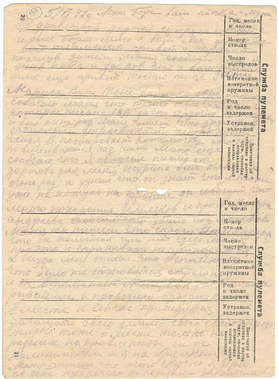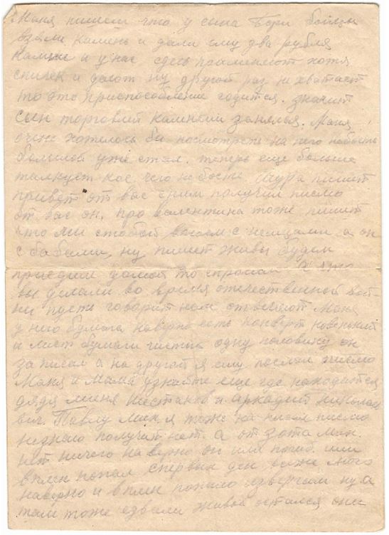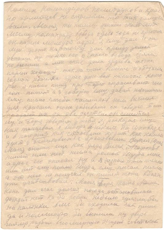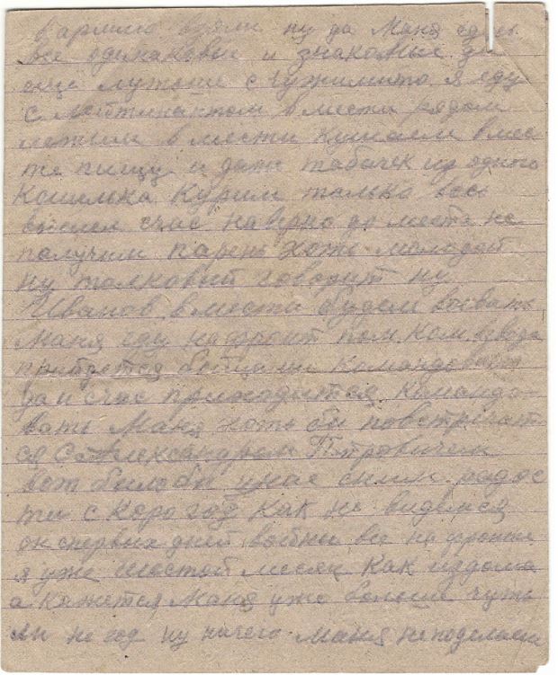 Маня пишеш что у сына Бори бойцы взяли камень и дали ему два рубля Камьне и у нас сдесь применяют хотя спичек и дают ну другой раз не хватает то это приспособление годится. значит сын торговлей камнями занялся. Маня очень хотелось бы посмотреть на него небость большой уже стал. теперь еще больше талкует кое чего не бость. Шура пишет привет от вас сним получил писмо от вас он. про валентина тоже пишет что мы стобой воюем с немцами а он с бабами, ну пишет живы будем приедем домой то спросим а что вы делали во время отечественной войны пусть говорит нам отвечают Маня у него бумага наверно есть конверт новенький и лист бумаги чистый одну половину он за писал а на другой я ему послал писмо Маня и мама узнайте еще где находится дядя миня Шестаков и аркадий николаевич. Павлу мих. я тоже на писал писмо незнаю получит нет. а от зота Мих. нет ничего на верно он или погиб. или в плен попал спервых ден всеже много наверно и в плен попало извергам ну а там тоже едвали живой остался они Наших Командиров политруков и Красно армейцев не стреляли то так замучивали. Маня ты пишеш узнать сколь лет моему Командиру взвода сдесь года не причем он парень молодой адрес я ему дал и он мне фото карточку дал приеду домой увидиш ну только его с моего взвода взяли по высили а мне счас дали другова тоже парень хороший также спали вместе и обедали содного котелка адрес уже вот написал которое я писмо пишу про Борю спрашивает чего сын пишет а я говорю ему давай напишем ему писмо чтобы камешков нам выслал для крисала огонь добывать он говорю там продает их за две десятки. он смеется ну и Боря говорит у тебя я раскозал ему как танцевал в выбора в школе на суховязе и в ногорной как строевым ходит как командует у Бабиковых с братовьями Витей Юрой Маня опиши еще как дядя Витя Агафонов пишет или нет писма домой Шура мне адрес его описал ну я незнаю толи писать или нет ему писмо Шура ему писал писмо а от него не получил он пишет тоже вбоях уже участвовал. Маня Боря Тятя Мама Кока дни счас долгия погода остановилась дождей нет ка бы войны небыло гулялибы на палянки влес бы сходили чай пить да и поллитро бы выпили ну зверь гитлер разбил всю мирную жизнь советской страны и всего мирного человечества да теперь и сам нерад ему приходит окончательная гибель. хотя и нас много положит ну без этого войны не бывает, а всеже ему советский народ не даст сесть на плечи и не мы то наши дети будут жить хорошо. Только я вас Маня Тятя Мама Кока еще раз по прошу пока все Живы поднимите и воспитайте дорогова и любящего моего сына Борю а я Жив буду приеду домой то за ваше доброе с вами раз читаюсь и до конца жизни не брошу. и сапоги все ровно надо хоть к осини ну всеже сшить и сказать ему что папка велел обязательно. ну пока все дорогая моя семья Маня Боря Тятя Мама Кока пока досвиданья целую вас тысячу раз а сына Борю и сели бы встретится то за целовал бы я его и считало что и он был бы рад увидел папку. Передайте привет Федору И. марусе Тете Насте с детками Куприяновым всем Шабрам Марковым Соколовым тетке Кате с зиной павловой семье. Сидоровым Шестаковым. Котельниковым обоим Козыревым пусть адрес Алешин дадут ли служит он. Ну остальным всем родным и знакомым писал ваш муж папка сын племяник 28/VI 42 Ник Иванов Ивановым