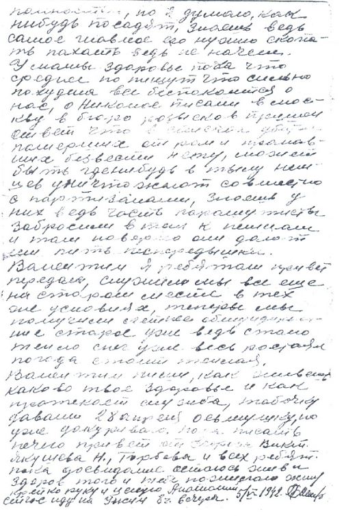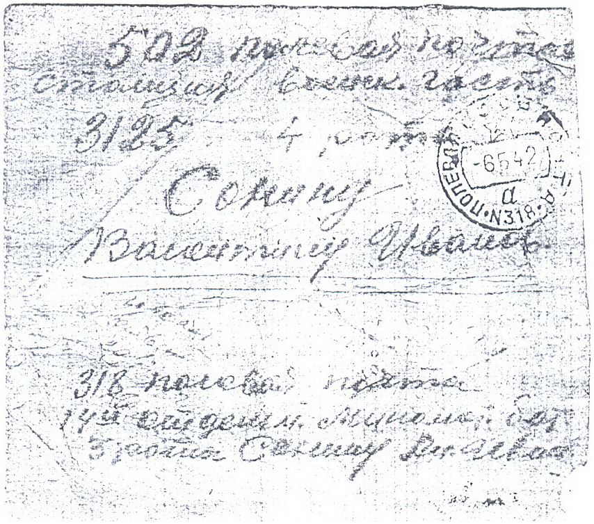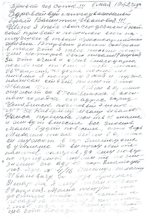 Шлю я тебе свой сердечный братский привет и пожелаю всего наилучшего в твоей красноармейской жизни. Впервым долгом сообщаю о том что я твое письмо получил которое было писано 17 апреля за что очень и очень благодарю, последнее письмо я тебе писал 26го апреля, из дома последнее письмо я получил 3 мая и тутже написал ответ, пишут что Ивана Ивановича взяли в армию служит он в Челябинске в военном городке его адрес город Челябинск почтовый ящик № 32 Киверину Ивану Иванов. Раиса перешла жить к маме и живут вместе все знаешь маме будет повеселее, ато ведь Михаила тоже взяли в армию он служит в гор. Златоусте в училище по выпуску лейтенантов саперов, да ему наверно придется служить пожизненно его адрес гор. Златоуст поч. ящ. № 4/16 Сонину Михаилу Ивановичу. Он туда приехал 31 марта Я ему писал письмо 24 апреля. Мама пишут что достали табачных семян и посадят табачку я им писал чтоб садили побольше и вообще что посадили весь огород полностью, но я думаю, как нибудь посадят, знаешь ведь самое главное его нужно скопать пахать ведь не начем. У мамы здоровье пока что среднее но пишут что сильно похудела все беспокоится о нас, о Николае писали в Москву в бюро розысков пришел ответ что в списках убитых померших от ран и пропавших безвести нету, может быть гденибудь в тылу немцев уничтожают совместно с партизанами, знаешь у них ведь часть парашутисты забросили в тыл к немцам и там наверно они дают им пить песпередышки. Валентин я ребятам привет передал, служим мы все еще на старом месте в тех же условиях, теперь мы получили летнее обмундирование старое уже ведь стало тепло снег уже весь ростаял погода стоит теплая.