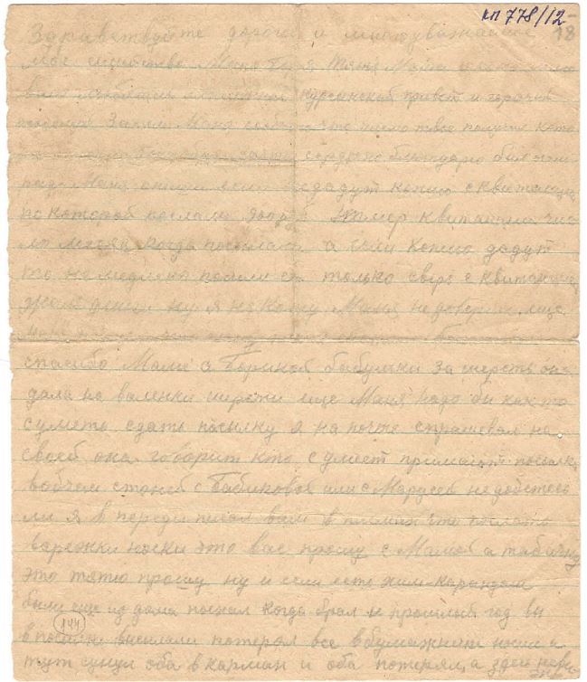Здравствуйте дорогое много уважаемое мое семейство Маня Боря Тятя Мама и Кока первым долгом шлю я вам свой пламенный привет и горячий поцелуй а сына Борю Крепко Крепко прежимаю к своей груди и поздравляю с днем рождения и желаю быть здоровым расти большим и быть счастливым затем спешу вас уведомить что живу пока ничего сдоровье маленько налаживается ляжу в сан части ну на днях наверно выпишут положили 11 октября в первые дни плоховато было трясла нет снача а счас перестала но сильная слабость похудел шибко и кружит едва хожу ну ничего поправлюсь только бы от ступилась она от меня. Маня еще опишу насчет денег 900 руб проси копию с перивода если не дадут то опиши номер перивода и какого числа посланы деньги я на центральную почту в уфу на писал писмо незнаю чего оне мне ответят. меня прямо поражает уже мог получить и очень жаль хотя мне бы или обратно прислали квам всеже тяжко было на сердце. Маня я в переди писал что бы вы послали посылку ну наверно не удасся вам послать я считал что разрешено примать посылки сдесь болтали ребята что промают а оказывается только кто сумеет сдать то приходят несколько сдесь ребят получили я спрашивал так оне говорят то свой то знакомый кто нибуть на почте а унас нет никого свояк был и тот сделался чужим да нет его в уфалеи