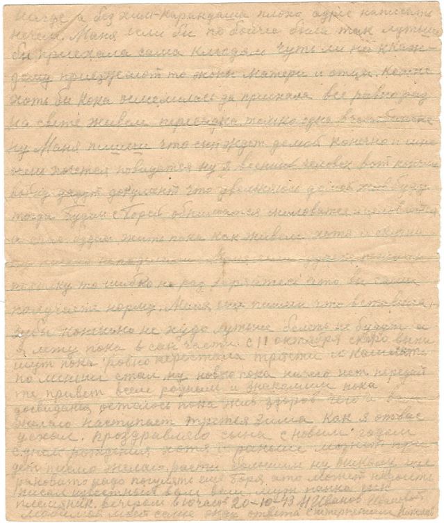 Здравствуйте дорогое и много уважаемое мое семейство Маня Боря Тятя Мама и Кока шлю вам любящий пламенный курсанский привет и горячий поцелуй Затем Маня сообчаю что писмо твое получил которое писано 5 октября зачто сердечно благодарю был очень рад Маня опиши если выдадут копию с квитанции по которой послали 900 руб. номер квитанции число месяц когда посылала а если копию дадут то немедлено пошли ее только сверь с квитанцией жаль деньги ну я не кому Маня не доверял еще (…) (…) (…) (…) (…) спасибо Маме а Бориной бабушке за шерсть она дала на валенки шерсти еще Маня надо бы как то с уметь сдать посылку я на почте спрашивал на своей она говорит кто с умеет примают посылки вобчем стоней с Бабиковой или с Марусей не добетесь ли я в переди писал вам в писмах что послать варежки носки это вас прошу с Мамой а табачку это тятю прошу ну и если есть хим-карандаш были еще из дома поехал когда брал и прошлый год вы в посылке высылали потерял все в бумажнике носил и тут сунул оба в карман и оба потерял, а здесь невидно нигде а без хим-карандаша плохо адрес написать нечем Маня если бы по бойчее была так лутьши бы приехала сама клюдям чуть ли ни ккаждому приезжают то жоны матери и отцы. Комне хоть бы Кока осмелилась да приехала все равно раз на свете живем пересадка только одна в челябинске ну Маня пишеш что сын ждет домой конечно и мне очень хочется повидатся ну я военный человек вот кончим войну дадут документ что увольняюсь домой жив буду тогда Будем с Борей обниматся миловатся и целоватся а счас будем жить пока как живем хотя и скучно ну нечего неподелаеш Маня если удасся послать посылку то шибко не раз заряйтесь ато вы сами получаете норму. Маня еще пишеш что вставила зубы конешно не худо лутьше болеть не будут а я лежу пока в сан части с 11 октября скоро выпишут пока ровно перестала трясти и кашлять по меньше стал. ну нового пока ничего нет передайте привет всем родным и знакомым пока досвиданья остаюсь пока жив здоров чего и вам желаю наступает третья зима как я отвас уехал. проздравляю сына с новым годом с днем рождения хотя и раньше может придет писмо желаю расти большим ну вшколу еще рановато надо погулять еще Боря ато может надоесть писал известный вам ваш муж папка сын племяник. вечером в 10 часов 20-10-43 Н Иванов Ивановой любимой моей семье жду ответа с нетерпением Николай