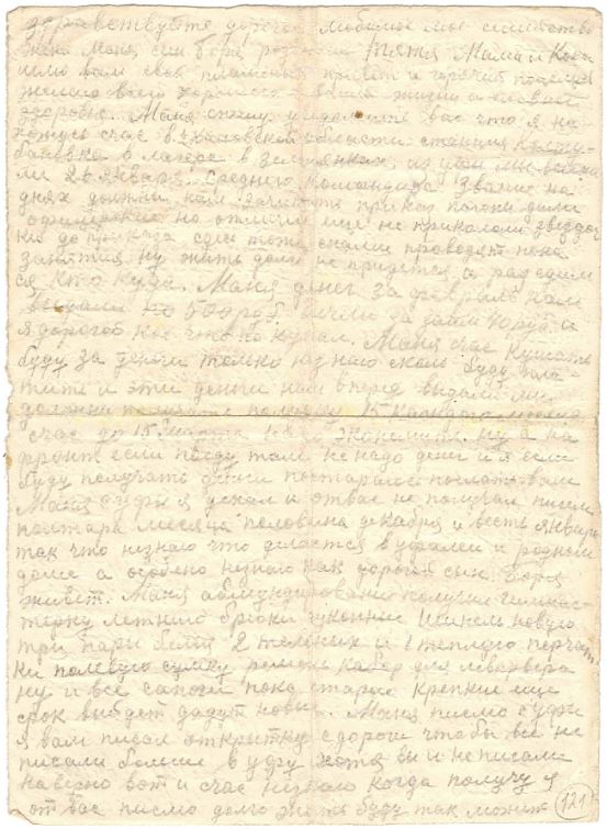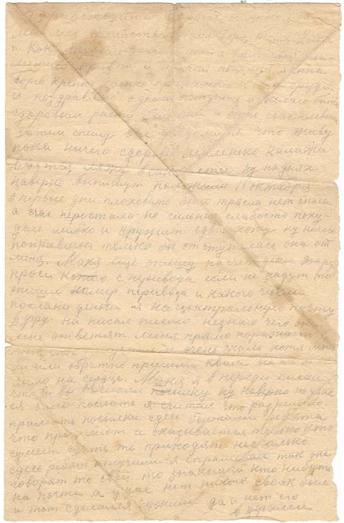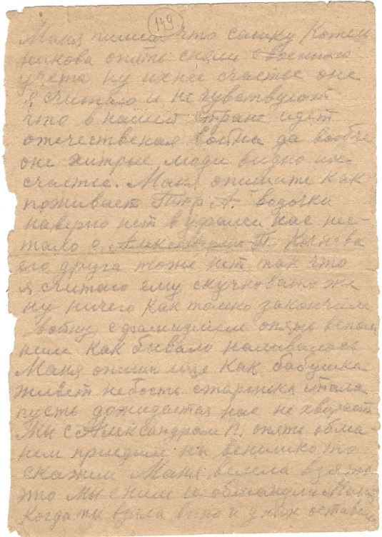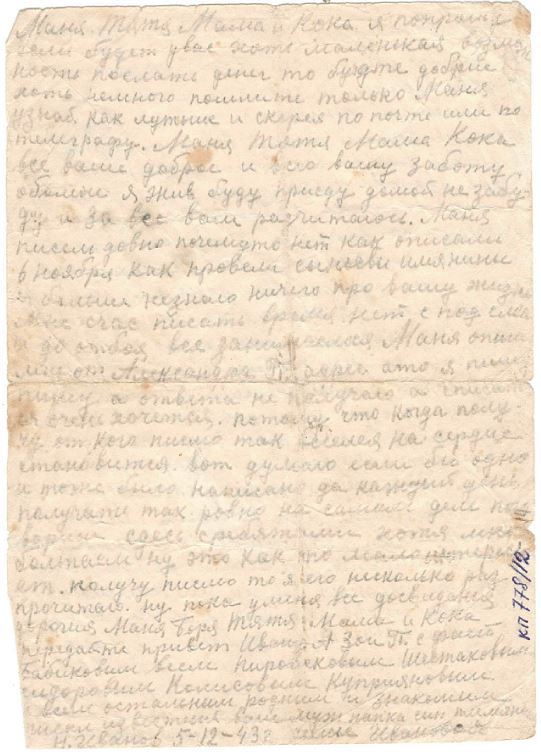 Маня пишеш что Сашку Котельникова опять сняли с военного учета ну ихнее счастье оне я считаю и не чувствуют что в нашей стране идет отечественая война да вообче оне хитрые люди видно их счастье. Маня опишите как поживает Петр А. водочки наверно нет в уфалеи нас нестало с Александром П. Кочнева его друга тоже нет так что я считаю ему скучновато же ну ничего как только закончим войну с фашизмом опять вспомним как бывало наливалось Маня опиши еще как бабушка живет небость старенька стала пусть дожидается нас не хворает Мы с Александром П. опять обманем приедим на венишко то скажем Маня велела взять это мы с ним ее обманули Маня когда ты взяла вино и уних оставила а нам выпить захотелось и придумали кней идти он все поминал ну Петрович ладно мы бабушку обманули Маня ровно не верится что придется повидатся и свами и с Шурой. Ну нечего станем надеится что встретимся и заживем по новому. Маня а насчет денег я еще про пишу продай хоть чего не жалей и вышли. Ну пока все Маня досвиданья остаюсь жив здоров чего и вам желаю целую крепко крепко а сына еще еще и еще раз. передай привет старикам нашим и всем родным и знакомым. писал вчера немного а сегодня дописывал тойсь 6 начал а 7-11-43 г кончил