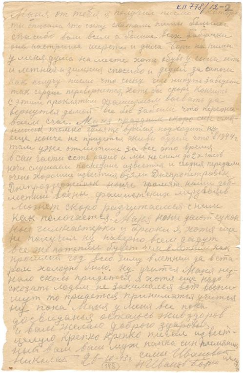 Маня от тебя я получил писмо вкотором ты описала что сыну скатали пимы большое спасибо вам всем а больше всех бабушки она настригла шерсти и дала Боре на пимы у меня душа на месте хоть обувь у сына есть и летния и зимния спосибо и дедки за сапоги Как получу писмо что сыну чего нибуть заведете так сердце перевернется, хоть бы скоре кончить с этим проклятым фашизмом воевать да вернутся домой все бы забыли что переживаем счас. Маня праздник скоро сын имяниник только гулять время подходит ну еще нонче не придется живы будем что в 1944 г там уже отметим за все это время в сан части есть радио и мы не спим до 2х часов ночи слушаем последние известия и сеодня передали очень хорошие известия взяли Днепропетровск Днепродзержинск нонче громят наши доблестные воены фашистских мерзавцев может скоро разчитаемся сними как пологается. Маня нонче дают суконные гимнастерки и брюки я хотя еще не получил ну наверно всем дадут все же потеплее будет чем в летнем как прошлый год всю зиму в летнем да в старом холодно было. Ну учится Маня незнаю сколь придется я хотя еще надо сказать лодом не занимался вот выпишут то придется приниматся учится ну пока Маня у меня все пока досвиданья остаюсь жив здоров и вам желаю доброго здаровья целую Крепко Крепко писал известный вам ваш муж папка сын племяник Николай 25-10-43 г семье Ивановой целую Борю