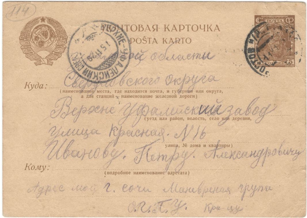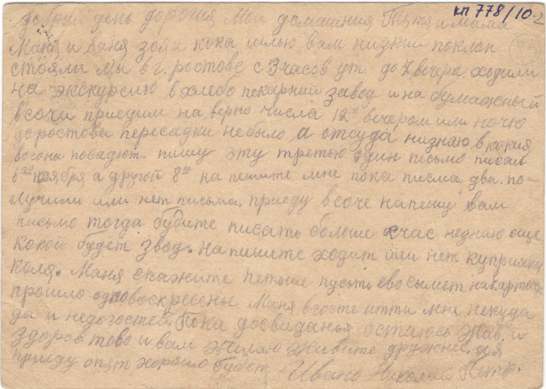 Добрый день дорогия Мои домашния Тятя и мама Маня и ваня зоя и кока шлью вам низкий поклон стояли мы в г. ростове с 3 часов ут. до 7 вечера ходили на экскурсию в хлебо пекарний завод и на бумажный в сочи приедим на верно числа 12го вечером или ночю доростова пересадки небыло а отсуда низнаю в кокия вогоны посадют. пишу эту третью один письмо писал 6го ноября а другой 8го на пешите мне пока писма два. получили или нет письма. приеду в соче напешу вам письмо тогда будите писать больше счас незнаю еще кокой будет звод. На пишите ходит или нет Куприяну Коля. Маня скажите петьке пусьть ево сымет накарточк прошло одно воскресенье Маня вгосте итти мне некуда и недогостей. Пока досвиданья остаюсь Жив и здоров тово и вам Желаю Живите дружнее а я приеду опят хорошо будет. Ивано Николай Петр.