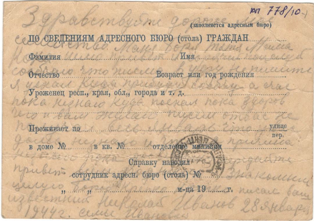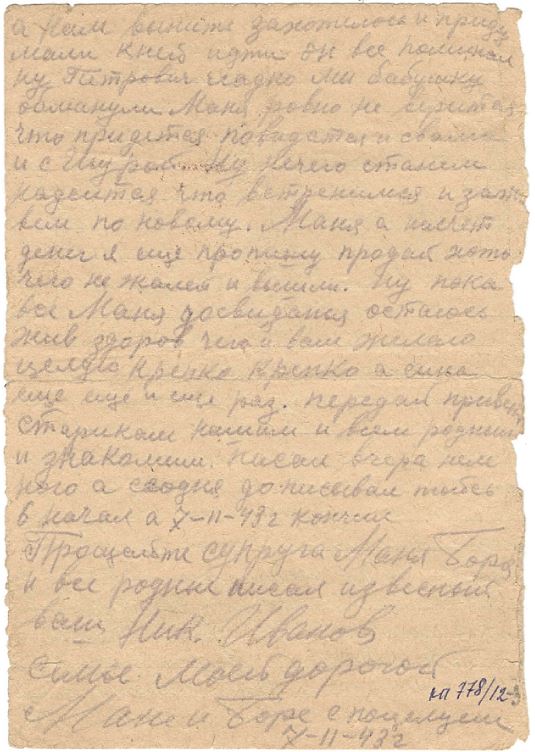 Целую крепким поцелуем и желаю поскорея бы в стретится с вами со всеми 10/Х 43 г Николай Иванов жене Мане сыну Боричке