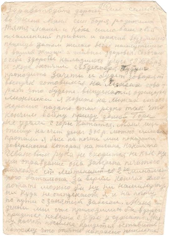 Здравствуйте дорогое мое семейство жена Маня сын Боря родители тятя мама и Кока шлю вам свой пламенный привет и горячий воздушный поцелуй затем желаю всего наилутьшего в вашей жизни а главное здоровья. Сообчаю о себе здоровье наладилось учусь с 9 ноября и скоро окончим с 25 декабря будут проходить зачеты и будет говорят выпуск готовимся на лыжах говорят что будет выпускатся офицеры лыжники я ходить на лыжах стал хорошо падать стал редко так что кончим войну приеду домой Бори не удам с горы кататся. Маня еще опишу на счет денег 900 р. можно считать пропали я был на почте мне показали довереность которая на писана какимто Ивановым рука не сходится не как ну им оправдание она заверена печатью какойто ст лейтенант со 2го минаметного батальона за верил конечно хлопотать можно бы ну ни наминуту ни куда не отпускают я и на почту по пути с занятий забегал. Маня а деньги мне счас пригодились бы в дороге придется наверно до Уфы у езжать. Маня ну насчет посылке придется оставить потому что опять напрасно пошлете Маня Тятя Мама и Кока я попрашу если будет увас хоть маленькая возможность послать денег то будте добрые хоть немного пошлите только Маня узнай как лутьше и скорея по почте или по телеграфу. Маня Тятя Мама Кока все ваше доброе и всю вашу заботу обомне я жив буду приеду домой не забуду и за все вам разчитаюсь. Маня писем довно почемуто нет как описали 6 ноября как провели сыньевы имянины и больше незнаю ничего про вашу жизнь мне счас писать время нет с под ема и до отбоя все занимаемся Маня опиши мне от Александра П. адрес ато я пишу пишу а ответа не получаю а списатся очень хочется. Потому что когда получу от кого писмо так веселея на сердце становится. вот думаю если бы одно и тоже было написано да каждый день получать так ровно на самом деле поговориш сдесь сребятами хотя много болтаем ну это как то мало интересует. получу писмо то я его несколько раз прочитаю. ну пока уменя все досвиданья дорогия Маня Боря Тятя Мама и Кока передайте привет Ивану А Зои П. с фаей Бабиковым всем Пировсковым Шестаковым Сидоровым Колисовым Куприяновым всем остальным родным и знакомым писал известный ваш муж папка сын племяник Н. Иванов 5-12-43 г. семье Ивановой