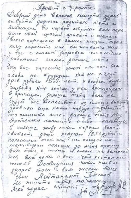 Добрый день веселая минута здравствуйте дорогие родители тятя и мамаша во первых строках вам передаю свой горячий привет и желаю всего хорошего в вашей жизни тятя хочу спросить как вы живете как у вас с мамой здоровье что сейчас работает мама дальше тятя хочу вас спросить дают или нет вам хлеба на трудодни как на счет дров. рубили или нет. И вообче как живетя кто сейчас у нас бригадиром в бригаде. дальше тятя если не будут вас обеспечивать из колхоза вывозко дров или еще каких небудь надобностей то пишите мне дальше тятя хочу коротянько написать о себе нахожусь в польше живу пока хорошо всего хватает. денег получаю 1350 рублей но польскими так как на хожусь на територии польши за меня прошу вам тятя, а также и маме не беспокоится вот пока и все что я хотел написать Досвидания пока жив и здоров того и вам желаю ваш сын Лейтенант Кленов