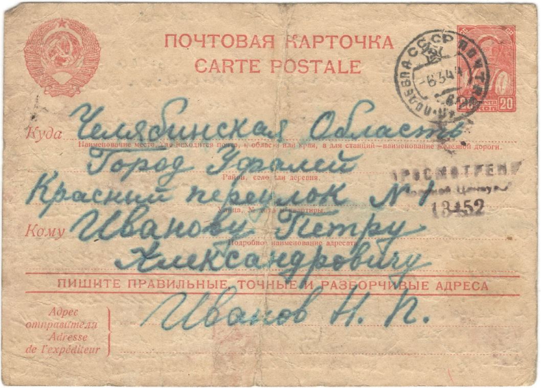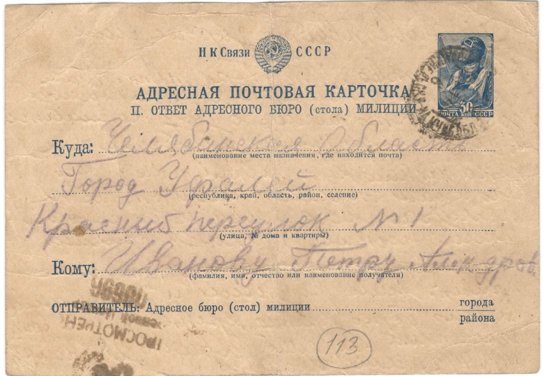 Здравствуйте дорогое мое семейство. Маня Боря тятя Мама Кока шлю привет и горячий поцелуй сообчаю что писем в Уфу непишите я уехал куда прибуду сообчу а счас пока незнаю куда поехал пока жив здоров чего и вам желаю писем отвас не получал весь январь что увас дома незнаю и что за причина незнаю пока досвидания передайте привет всем родным и знакомым целую Борю Крепко Крепко писал ваш известный Николай Иванов 28 января 1944 г. семье Ивановых