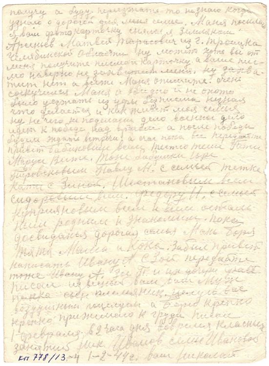 Здравствуйте дорогое любимое мое семейство жена Маня сын Боря родители Тятя Мама и Кока шлю вам свой пламеный привет и горячий поцелую желаю всего хорошего в вашей жизни а главное здоровья. Маня спешу уведомить вас что я нахожусь счас в Чкаловской области станция Крятубановка в лагере в землянках. из уфы мы выехали 26 января среднего командира звание на днях должны нам зачитать приказ погоны дали офицерские но отличие еще не прикололи звездочки до приказа сдесь тоже снами проводят пока занятия ну жить долго не придется а раз едимя кто куда. Маня денег за февраль нам выдали по 500 руб. вычлю за займ 70 руб. и я дорогой кое что по купал. Маня счас кушать буду за деньги только незнаю сколь буду платить и эти деньги нам вперед выдали мы должны получать только 15 календарного месяца счас до 15 марта надо экономить. Ну а на фронт если поеду там не надо денег и я если буду получать деньги постараюсь послать вам Маня с уфы я уехал и отвас не получал писем полтара месяца половина декабря и весть январь так что незнаю что делается в уфалеи и родном доме а особено незнаю как дорогой сын Боря живет. Маня абмундирование получил гимнастерку летнию брюки суконные шинель новую три пары белья 2 тельных и 1 теплую перчатки полевую сумку ремень набор для леворвера ну и все сапоги пока старые крепкие еще срок выйдет дадут новые. Маня писмо с уфы я вам писал открытку с дороги чтобы все не писали больше в уфу хотя вы и не писали наверно вот и счас незнаю когда получу я от вас писмо долго жить буду так может получу а буду переезжать то незнаю когда узнаю о дорогой для меня семье. Маня посылал я вам фотокарточку снялся я земляком Арсеньев Матвей Тарасович из г. Троицка Челябинской Области ну может хоть вы от меня получите писмо и карточку а ваше писмо наверно не захватит меня. Ну захватит нет а всеже Маня опишите. очень соскучился Маня и обидно и не охото было уезжать из уфы без писма незная что делается и как живет моя семья ну не чего не поделаеш дело военное дело идет к победе над врагом а после победы будем ждать встречи. а счас пока все передайте привет Бабиковым всем тестю теще Пети Марусе Вите. Тоне бабушки Юре Пировсковым Павлу М. с семьей тетке Кати с Зиной. Шестаковым всем Сидоровом всем. федору И. с семьей Куприяновым всем и всем остальным родным и знакомым. пока досвиданья дорогая семья Мань Боря Тятя Мама и Кока. Забыл привет написать Ивану А С Зоей передайте тоже Ивану А. Зое П. и их дочери фаи писал извесный вам ваш муж папка сын племяник. целую вас воздушным поцелуем а Борю крепко крепко прижемаю к груди писал 1 февраля в 2 часа дня вовремя класных занятий Ник. Иванов семье Ивановой 1-2-44 г. ваш Николай