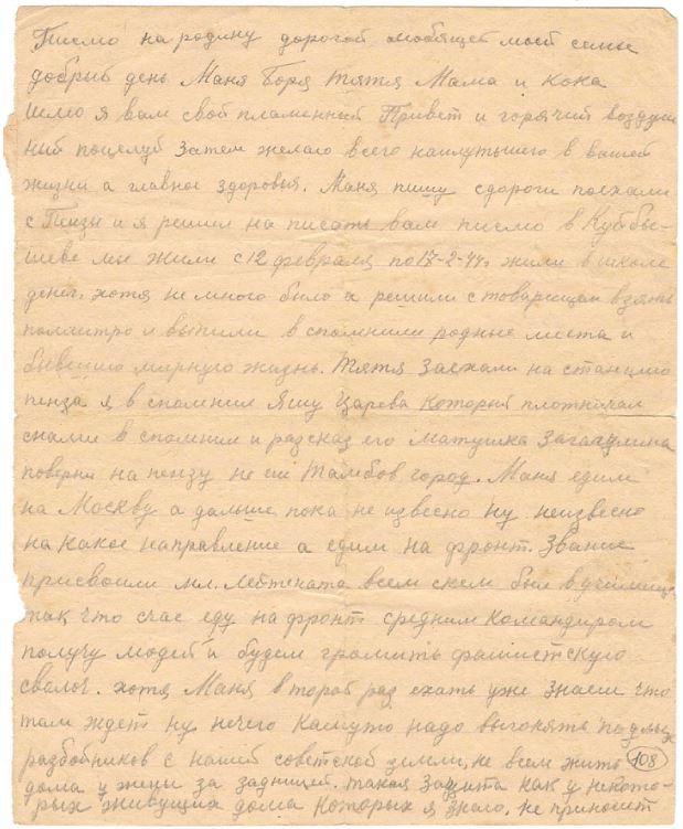 Писмо на родину дорогой любящей моей семье добрый день Маня Боря Тятя Мама и Кока шлю я вам свой пламенный Привет и горячий воздушный поцелуй Затем желаю всего наилутьшего в вашей жизни а главное здоровья. Маня пишу сдороги поехали с Пензы и я решил на писать вам писмо в Куйбышеве мы жили с 12 февраля по 17-2-44 г жили в школе денег хотя не много было а решили с товарищем взять поллитро и выпили в спомнили родные места и бывшию мирную жизнь. Тятя заехали на станцию пенза я в спомнил Яшу Царева который плотничал снами в спомнил и разсказ его матушка Загагулина поверни на пензу не еш Тамбов город. Маня едим на Москву а дальше пока не извесно ну неизвесно на какое направление а едим на фронт. Звание присвоили мл. лейтената всем скем был в училище так что счас еду на фронт средним командиром получу людей и будем громить фашистскую сволоч. хотя Маня второй раз ехать уже знаеш что там ждет ну нечего камуто надо выгонять надо выгонять подлых разбойников с нашей советской земли. не всем жить дома у жены за задницей. такая защита как у некоторых живущих дома которых я знаю. Не приносит ни какой пользы, кроме защиты своей шкуры да наживы. Ну нечего Маня победа не далеко живы останемся хотя прожитого не догонеш а жить будем не хуже ихнего. Жаль Маня вот писем я от вас не получал с половины декабря 1943 г. С уфы на Куйбышеве нас догнал один наш офицер сказал что с зади еще наши с уфы едут и везут писма и мне сказал что два писма есть но эти товарищи с дешние жители и заехали домой так мы вот уехали из Куйбышева а их все не было и так опять не получил и теперь незнаю когда получу. и так Маня скучно и досадно и на вас обижусь и опять думаю наверно не доходили а тут еще эти друзья уж если оне знали что мимо дома едут надо было передать писма которые поехали вперед. вот Маня Боря Тятя Мама и Кока какия дела Как вы живете я счас незнаю ну Маня приеду куда на место сообчу и прошу вас как можно скоре опишите про свою жизнь. Маня я вышлю вам Атестат как приеду на место и вас должны прекрепить к военторгу. вот пока у меня все передайте привет Бабиковым тестю теще Пети Марусе Вите Тоне Бабушке Юре Ивану А С Зоей П. и фаей, Павлу М. с семьей тетке кати с Зиной, Шестаковым всем Сидоровым всем Колисовым всем Куприяновым и остальным всем родным и знакомым. пока досвиданья дорогия Маня Боричка Тятя Мама Кока целую крепко а Борю еще еще и еще раз и жму его крепко руку писал извесный вам ваш муж папка сын и племяник.