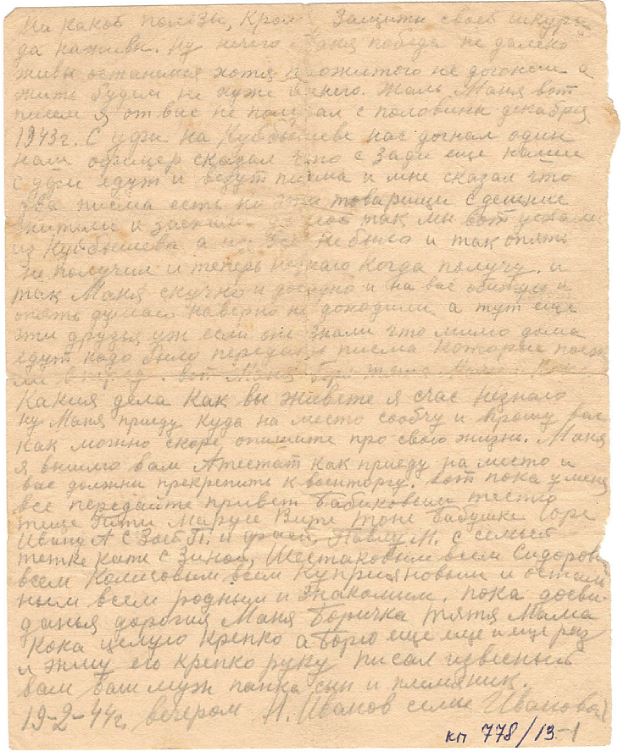 19-2-44 г. вечером Н. Иванов семье Ивановой