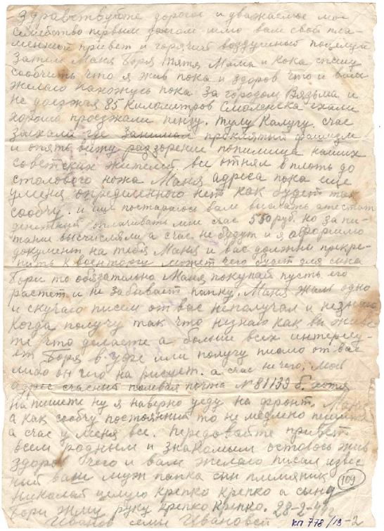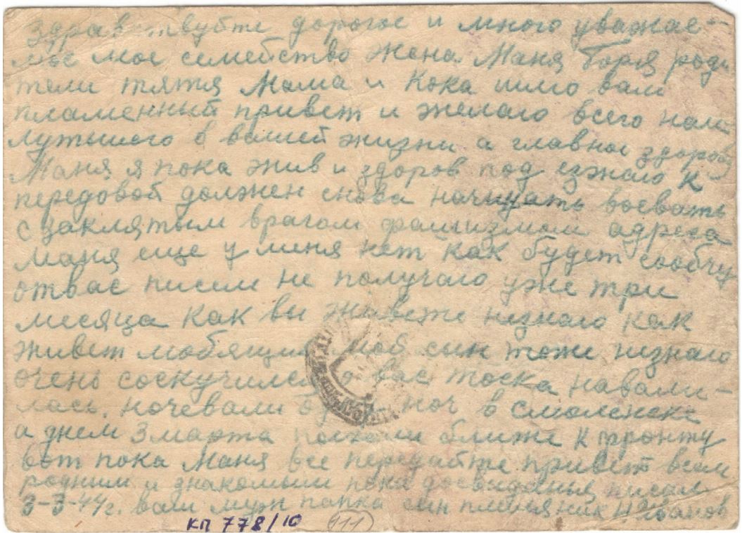 Здравствуйте дорогое и уважаемое мое семейство первым долгом шлю вам свой пламенный привет и горячий воздушный поцелуй затем Маня Боря Тятя Мама и Кока спешу сообчить что я жив пока и здоров что и вам желаю нахожусь пока за городом Вязьма и не доезжая 85 километров Смоленска ехали хорошо проезжали пензу. Тулу Калугу. счас заехали где Занимал проклятый фашизм и опять вижу раз зорение попилища наших советских жителей. все отнял в плоть до столового ножа Маня адреса пока еще уменя определенного нет как будет так сообчу. и еще постараюсь вам выслать атестат денежный оплачивать мне счас 550 руб. но за питание вычисляли а счас не будут и я оформлю документ на тебя Маня и вас должны прекрепить к военторгу может чего будет для сына Бори то обязательно Маня покупай пусть его растет и не забывает папку. Маня жаль одно и скучаю писем от вас неполучал и незнаю когда получу так что незнаю как вы живете что делаете а больше всех интересует Боря в Уфе или получу писмо от вас либо он чего на рисует. а счас не чего. Мой адрес счасный полевая почта № 81139 б. хотя на пишите ну я наверно уеду на фронт. Маня а как сообчу постоянный то не медлен пешите а счас у меня все. Передовайте привет всем родным и знакомым остаюсь жив здоров чего и вам желаю писал извесный ваш муж папка сын племяник Николай целую крепко крепко а сыну Бори жму руку крепко крепко. 28-2-44 г.