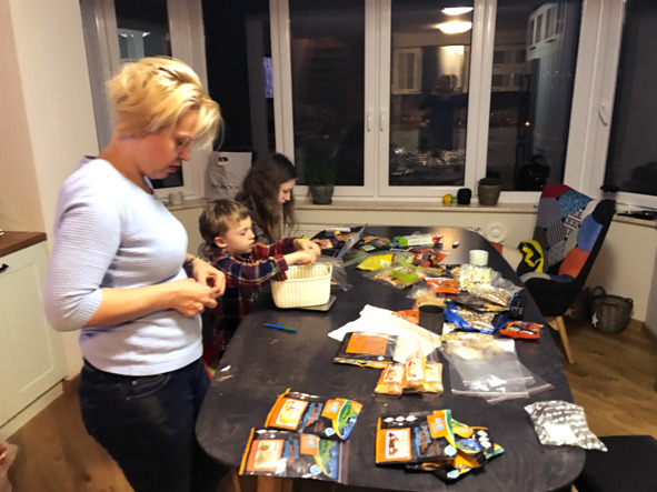 Во время сборов дома, продолжая бороться с лишним весом, мы всей семьёй пересыпали сублиматы из фольгированных тяжёлых упаковок в целлофановые зип-пакеты и расфасовывали сухофрукты по весу.