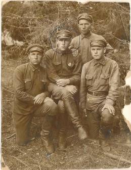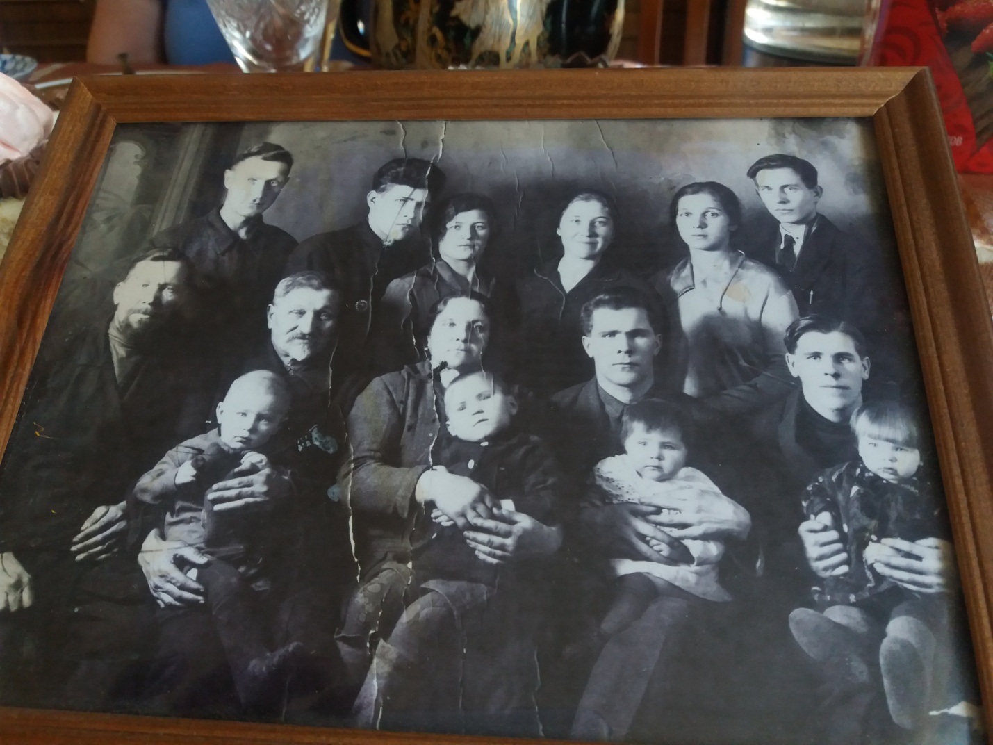 Сидят: Алексей Ефимов, отец Лизы, Степан Разин, мой прадед, у него на руках – Толя Разин, мой отец. Евдокия, мачеха бабы Лизы, у неё на руках – Веня Разин, мой дядя. Фёдор Разин, брат Василия, у него на руках – Тамара Разина, моя тётя. Последний Андрей Разин, брат Василия, на руках – Зоя Разина, моя тётя.