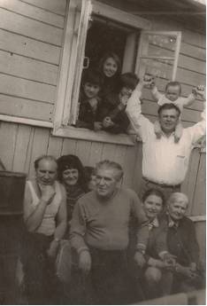 Лемболово. Слева направо: дядя Веня, Ольга, дед Вася, Лариса Северинко, баба Лиза. В окне: Дима, Ирина, Алёша, папа с маленьким Митей. 1978 г.