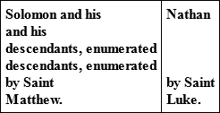 We read in a dangerous little book, composed with much art: "St. Matthew and St. Luke give each a genealogy of Christ different from the other; and lest it should be thought that the differences are only slight, such as might be imputed to neglect or oversight, the contrary may easily be shown by reading the first chapter of Matthew and the third of Luke. We shall then see that fifteen generations more are enumerated in the one than in the other; that, from David, they completely separate; that they join again at Salathiel; but that, after his son, they again separate, and do not reunite again but in Joseph.