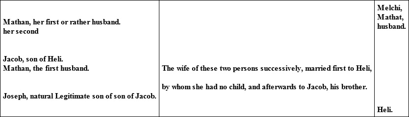 In order to reply to this objection, urged from the time of Origen, and renewed from age to age, we must read Julius Africanus. See the two genealogies reconciled in the following table, as we find it in the repository of ecclesiastical writers: