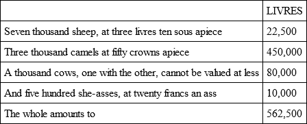 Now if you took thirty-two thousand infant girls, it is likely that there were as many infant boys, and as many fathers and mothers. These united amount to a hundred and twenty-eight thousand captives, in a desert where there is nothing to eat, nothing to drink but brackish water, and which is inhabited by some wandering Arabs, to the number of two or three thousand at most. You will besides observe, that, on all the maps, this frightful country is not more than eight leagues long, and as many broad.