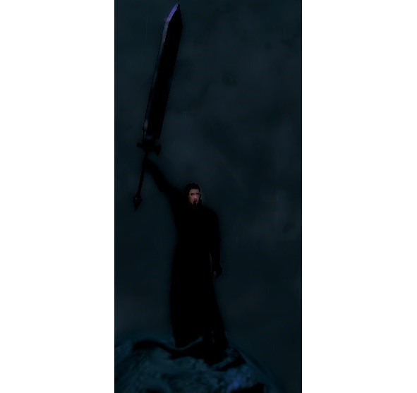 Вдруг послышался лязг меча и пронёсся сильный ветер, будто какие-то невидимые мечи пронеслись, отрубая головы демонов. Все были поражены – и демоны, и люди. В пятидесяти метрах стоял мужчина высокого роста, около двух метров, с чёрными, как смоль, волосами. Его глаза внушали страх, а меч, почти с его роста, бросался в глаза больше всего. Одет он был в лёгкое чёрное одеяние, подчёркивающее его ужасающий вид.