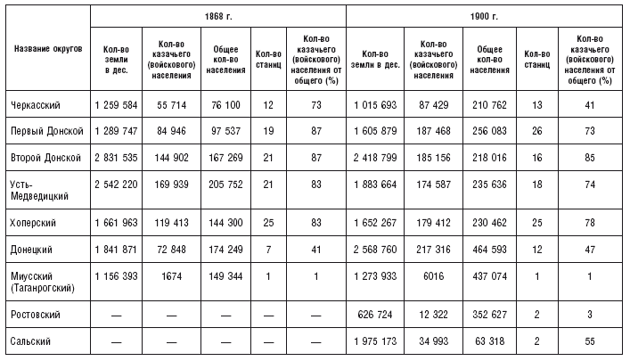 В таблице 2 представлены количественные данные о размерах округов, наличии станиц и численности казачьего населения, в том числе в процентном отношении к общему количеству населения в округах за 1868 и 1900 гг.48