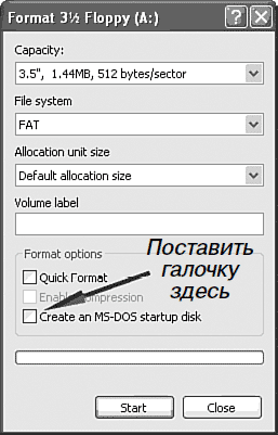 Среди опций форматирования имеется опция, которая называется Create an MS-DOS startup disk (Создать загрузочный диск MS-DOS). Выберите эту опцию и нажмите кнопку Start (Старт), чтобы отформатировать дискету. Windows XP отформатирует вашу дискету и скопирует на нее все файлы, которые нужны для запуска системы в среде DOS.