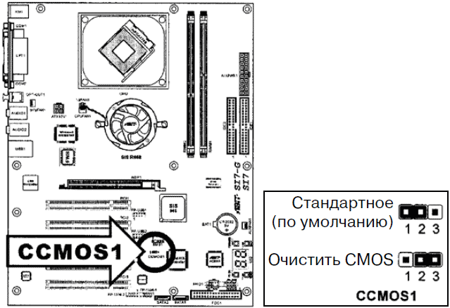 С помощью этого рисунка вы должны без труда найти джампер. Чтобы обнулить данные CMOS, сначала выключите систему. Обратите внимание на то, что вы должны полностью отключить питание. Это позволяет прервать стандартное питание напряжением 5 вольт, которое может помешать разрядке CMOS.