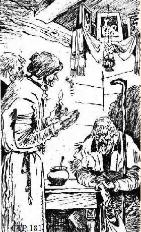 В избу вошел человек, на взгляд лет пятидесяти; лицо его было бледно и худо; одежда прохожего не походила на крестьянскую, не походила она и на солдатское одеяние, а представляла что-то среднее между военным и крестьянским. Посмотрев на него с недоверчивостию, хозяйка разбудила мужа и шепнула ему что-то на ухо. Хозяин постоялого двора, отставной солдат, менее боязливый, чем жена его, убедившись, что у прохожего не было ни ружья, ни палицы, и, видя, что, сняв с себя сумку, он преспокойно уселся под образами, спросил у него, не хочет ли он чего перекусить. Прохожий пошарил в карманах, в сумке и, не найдя, видно, денег, отвечал, что есть не хочет, а выпил бы воды и охотно прилег бы на печь.