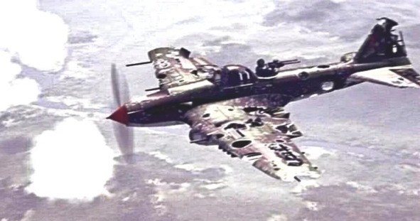 Японский летчик направляет свой подбитый бомбардировщик точно на американский корабль