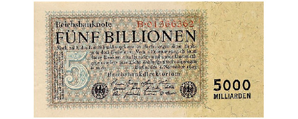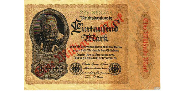 Miliard niemieckich marek w 1923 roku. Do tego czasu Niemcy nazywano Republiką Weimarską. Jakoś okazało się, że podział kraju może być ograniczony, co zapewnia hiperinflację (Nadrenii przygotowywał się do oderwania). Ceny podwajały się co trzy dni, w obiegu był tzw. Papierowy znaczek (Papiermark). Kufel piwa kosztował cztery miliardy. W 1924 r. Inflacja została zatrzymana. W połowie lat dwudziestych republika osiągnęła pewne sukcesy gospodarcze i polityczne, ale od 1929 r. Wysiłki bankierów, którzy podnoszą stopę dyskontową (z reguły nieetyczni Niemcy), tworzą nowy, choć nie tak silny, spadek. Ostatecznie Niemcy decydują, że wyjście jest w nowych przywódcach i III Rzeszy