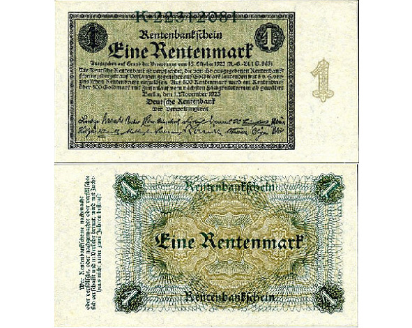 W listopadzie 1923 r. Kurs niemieckiego znaku wynosi 4,2 tryliona dolarów amerykańskich. W 1924 r., Równolegle do niego, nieoficjalna jednostka monetarna – tzw. znak najmu zabezpieczony zastawem nieruchomości. Stawka dla zwykłego znaku wynosi jeden do jednego tryliona. Kilka miesięcy później, nie jest uzasadniony Reichsmark (RM), która jest równa jej wartości nominalnej w, a obie te waluty, tak aby nie podważać zaufania ludności, pozostają w obiegu. Koszt jednego RM – 2,5 grama czystego srebra, który w obecnym tempie wynosi około 150 rubli. Pojawienie się tych nazw zawiesza hiperinflację (5000%, emisja zarobków – dwa razy dziennie, ludzie głodują).
