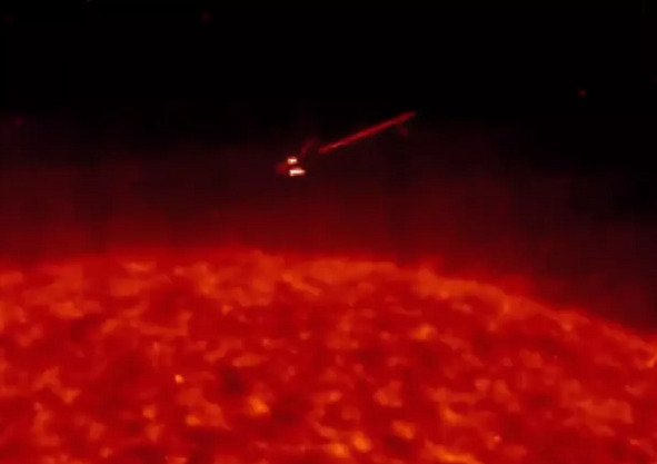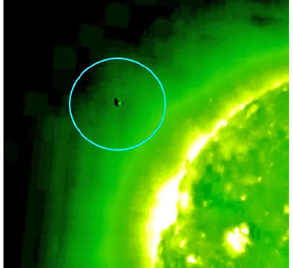 И вот еще один НЛО, сигарообразной формы, зависший над звездой. Не вполне понятно, на каком удалении от камеры находится данный объект. По некоторым признакам длина «столба» составляет три диаметра Земли. Специалисты НАСА объясняют феномен дефектами оптики, или же просто молчат. Тем не менее, согласно законам США о свободе распространения информации, фото полученные с космических зондов регулярно выдаются в мировую Сеть для просмотра всеми желающими. Скажем этим специалистам наше большое «Спасибо»
