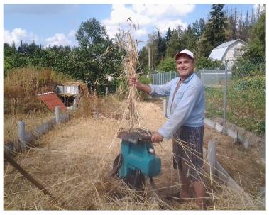 Рожь сжали по высокой стерне. Сжатые колосья с короткими соломенными стеблями пропустили через фрезерный измельчитель.В нём обмолотились хорошо вызревшие колосья. Если потрясти мешок измельчителя, то эти обмолоченные зёрна ссыпаются на дно мешка ниже соломы. В этих зёрнах примерно половина урожая. Измельчённые солому и колосья сверху мешка вынули, колосья, немного порезанные измельчителем, выбрали из соломы, отделили, и эти колосья сложили для дозаривания. Через несколько дней насыпали эти дозревшие колосья в мешки плетёные, мешки завязали и стучали по мешкам круглыми палками для окончательного обмолота без потерь зерна. Также брали мешки руками с двух сторон сжимали и тёрли. Потом разделили солому, остатки колосьев и зёрна пропустив смесь через сита.