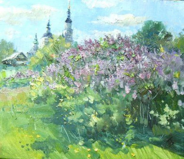 Картина художника Павла Весёлкина «Облака» – вид на наш дом и собор из Заречья. Бабушка очень любила сирень, а о чаплыгинском живописце я узнала как раз от неё – они дружили, бабушка посвятила ему стихотворение «Здесь» в книге «Созвездие Лебедь» – «Здесь идут берёзовые ливни…»
