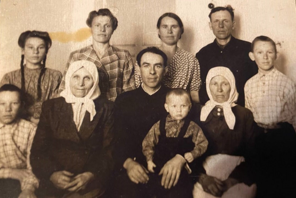 Бабушка Галина Григоренко слева вверху, рядом с ней стоит моя прабабушка, урождённая Мария Воробьёва. Слева в белом платке – моя прапрабабушка Екатерина Пармёновна Воротникова (Григоренко), в центре бабушкин отчим Геннадий, справа в белом платке – моя прапрабабушка Анисья Степановна Морозова, в замужестве – Воробьёва, мать прабабушки