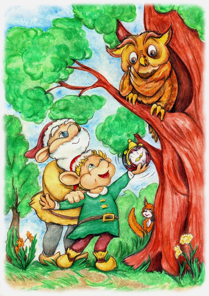 – Спасибо, я очень благодарна тебе за часы и твоему дедушке за беседу, – сова хлопала крыльями от радости – Ой, время спать. До свидания, мои дорогие гномы!