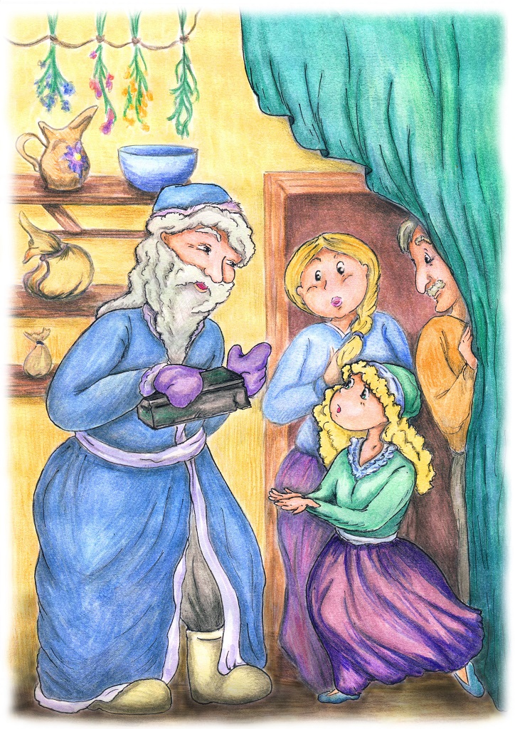 Встретил Морозко гостей, в дом пригласил. Попросил Марфушку помочь на стол накрыть. Но девочка и думать об этом не стала. Язык Морозко показала и отвернулась от него. Посмотрел волшебник на Марфушку и призадумался. Когда пришла пора гостям уходить, вручил он Марфушке шкатулку. Она была вся черная, покрытая плесенью, царапинами.