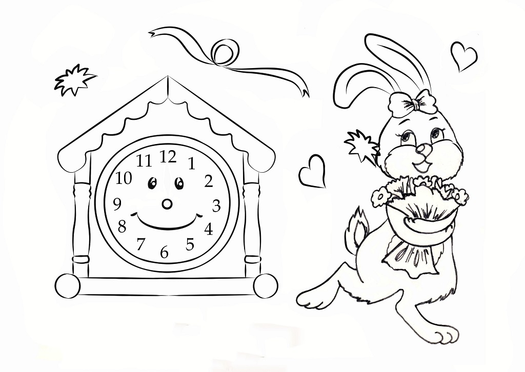 Машенька теперь знает, во сколько нужно ложиться спать, а у зайки часы сломались. Помоги ей понять, что пора спать. Нарисуй стрелочки на часах.