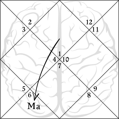 Пробуем связать Восходящий знак с положением Лагнеша в знаке и доме. Например, Восходящий Овен с Марсом в 3-м доме будет темпераментным и общительным. Он готов к групповой работе, где нужно проявлять себя через речь ярко и громко, чтобы добиться внимания и всех переспорить. Такой Овен эффективен, когда есть соревновательный момент и нужно «нападать» в рамках командной деятельности.