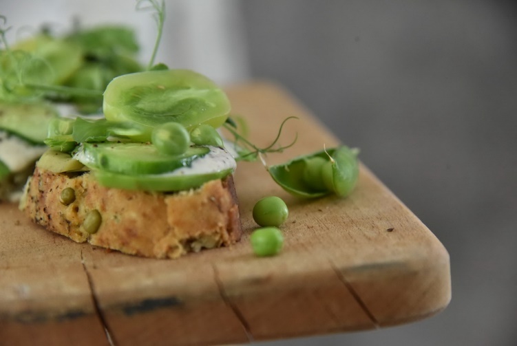 Положить на ломтики хлеба, смазанного соусом авокадо, тонко порезанный огурец, украсить помидором, машем и горошком. Подсолить. При желании для большей питательности можно добавить тофу или пшеничную колбаску.