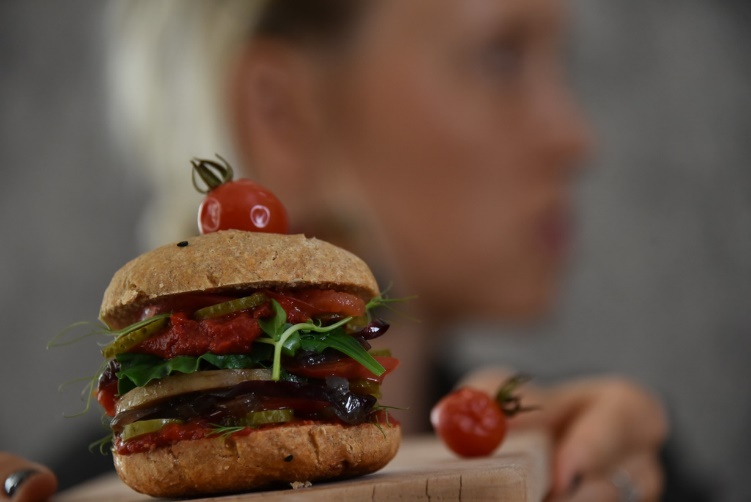 Разрезать ржаную булочку (можно любую по желанию), промазать нижнюю часть томатной пастой, красиво слоями уложить овощи, жареную картошку и зелень, закрыть крышкой.
