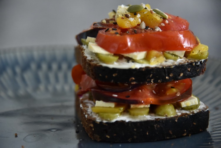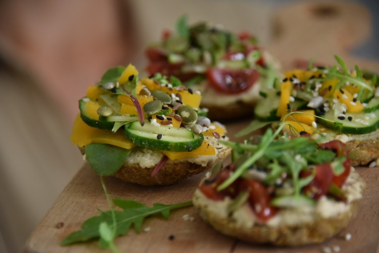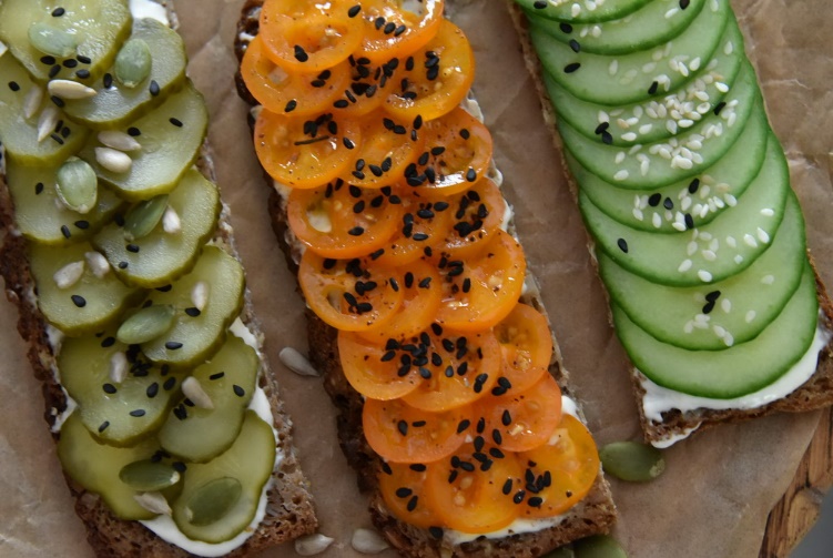 Ржаные бутерброды с кунжутным соусом, свежим огурцом (помидором), зеленью, тыквой и семечками