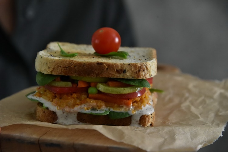 Положить на тосты, смазанные соусом, шпинат, затем тонко порезанный помидор, чечевичный фарш и заправку из кабачка. Накрыть вторым тостом. Можно оставить открытые бутерброды, или выложить все на тарелку и есть вприкуску с хлебом, или сделать роллы в лаваше!