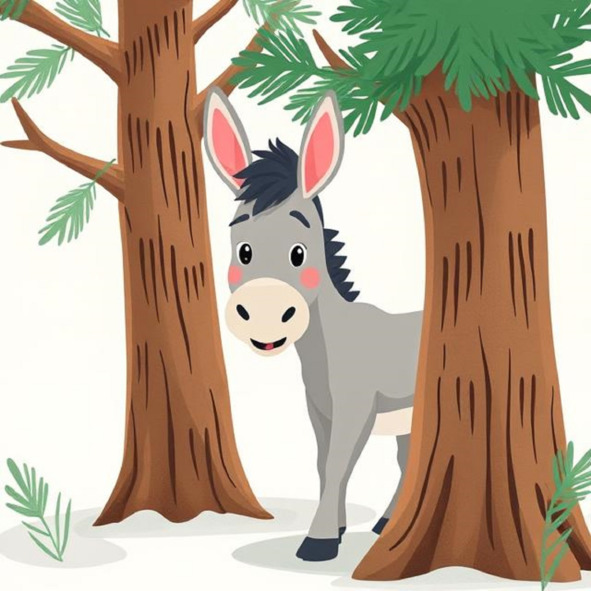 Путешественники повернулись на голос и увидели милого ослика, он прятался за большой ёлкой. Ослик улыбался и смотрел на ребят добрыми глазами: