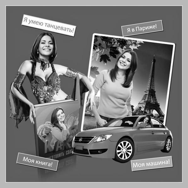 Коллаж МечтыЕсли, например, к изображению шубы своей мечты вы добавите собственную фотографию, а в салон любимой машины вклеите свою замечательное личико, то Доска Визуализации по мановению волшебной палочки превратится в Коллаж Мечты.